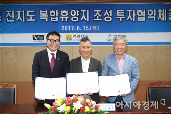 전라남도와 고흥군은 지난 15일 군청상황실에서 투자업체를 대표해 정재봉 ㈜한섬피앤디 회장과 우기종 전남도 정무부지사, 박병종 고흥군수가 참석한 가운데 진지도 복합휴양지 조성을 위한 투자협약을 체결했다고 16일 밝혔다.