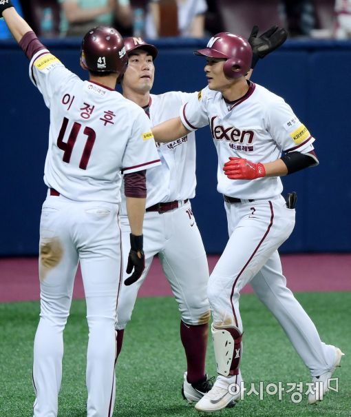 [아시아경제 김현민 기자]프로야구 롯데 자이언츠와 넥센 히어로즈의 2017 KBO리그 경기가 17일 서울 고척돔에서 열렸다. 3회말 무사 만루에서 넥센 김하성이 롯데 선발 박시영을 상대로 만루 홈런을 치고 선행주자들과 기뻐하고 있다.