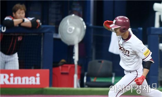 [아시아경제 김현민 기자]프로야구 롯데 자이언츠와 넥센 히어로즈의 2017 KBO리그 경기가 17일 서울 고척돔에서 열렸다. 3회말 무사 만루에서 넥센 김하성이 롯데 선발 박시영을 상대로 만루 홈런을 치고 경례 세리머니를 하고 있다.