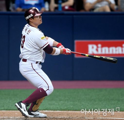 [아시아경제 김현민 기자]프로야구 롯데 자이언츠와 넥센 히어로즈의 2017 KBO리그 경기가 17일 서울 고척돔에서 열렸다. 3회말 1사에서 넥센 윤석민이 롯데 선발 박시영을 상대로 추가 솔로 홈런을 치고 있다.
