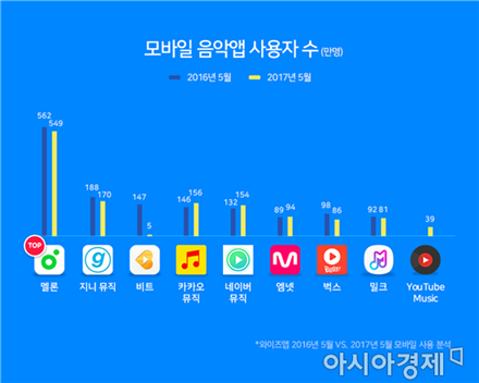 20일 앱 분석업체 와이즈앱은 5월 모바일 음악 앱 이용자 수 현황을 발표했다. 1위는 멜론으로 월 이용자 수는 549만명이었다. 2위는 지니뮤직(170만), 3위는 카카오뮤직(156만), 4위는 네이버뮤직(154만), 5위는 엠넷(94만), 6위는 벅스(86만), 7위는 밀크(81만) 순이었다.