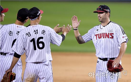 [아시아경제 김현민 기자]프로야구 삼성 라이온스와 LG 트윈스의 2017 KBO리그 경기가 20일 잠실구장에서 열렸다. LG 선발투수 허프가 5-3 승리를 확정한 뒤 동료들과 기뻐하고 있다.