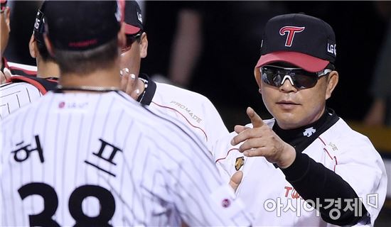 [아시아경제 김현민 기자]프로야구 삼성 라이온스와 LG 트윈스의 2017 KBO리그 경기가 20일 잠실구장에서 열렸다. LG 양상문 감독이 5-3 승리를 확정한 뒤 완투승을 거둔 허프와 기뻐하고 있다.