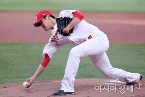 [인천=아시아경제 김현민 기자]프로야구 NC 다이노스와 SK와이번스의 2017 KBO리그 경기가 21일 인천 SK행복드림구장에서 열렸다. SK 선발투수 박종훈이 역투하고 있다.