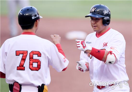 [인천=아시아경제 김현민 기자]프로야구 NC 다이노스와 SK와이번스의 2017 KBO리그 경기가 21일 인천 SK행복드림구장에서 열렸다. 2회말 SK 선두타자 최정이 중전 안타를 치고 출루한 뒤 김인호 코치와 하이파이브하고 있다.