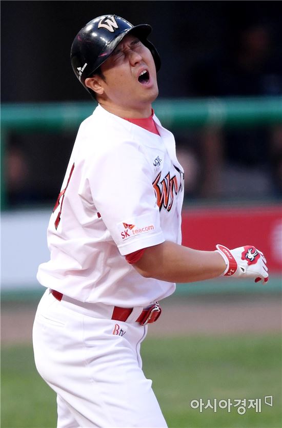[인천=아시아경제 김현민 기자]프로야구 NC 다이노스와 SK와이번스의 2017 KBO리그 경기가 21일 인천 SK행복드림구장에서 열렸다. 4회말 SK 선두타자 최정이 1루수 뜬공을 친 뒤 아쉬워하고 있다.