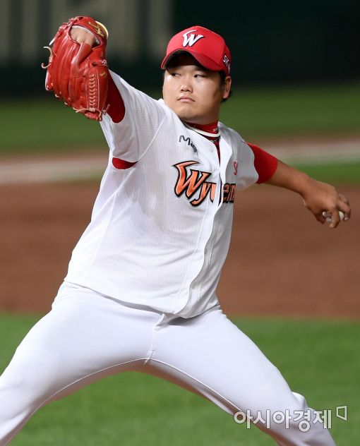 [인천=아시아경제 김현민 기자]프로야구 NC 다이노스와 SK와이번스의 2017 KBO리그 경기가 21일 인천 SK행복드림구장에서 열렸다. 7회초 SK 구원투수 김태훈이 역투하고 있다.