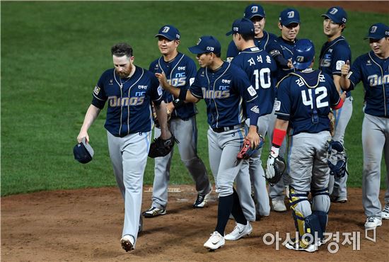 [인천=아시아경제 김현민 기자]프로야구 NC 다이노스와 SK와이번스의 2017 KBO리그 경기가 21일 인천 SK행복드림구장에서 열렸다. NC 선발투수 해커가 2-1 승리를 확정한 뒤 동료들과 기뻐하고 있다. 해커는 9이닝 1실점 완투승을 거뒀다.