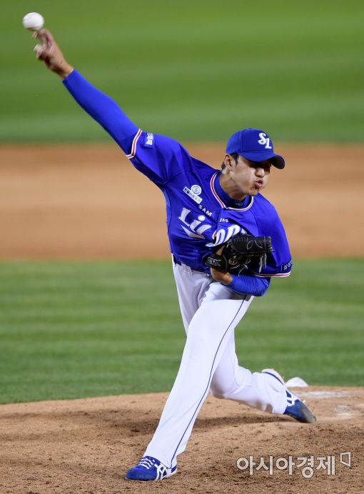 [아시아경제 김현민 기자]프로야구 삼성 라이온즈와 LG 트윈스의 2017 KBO리그 경기가 22일 잠실구장에서 열렸다. 6회말 삼성 구원투수 최충연이 역투하고 있다.