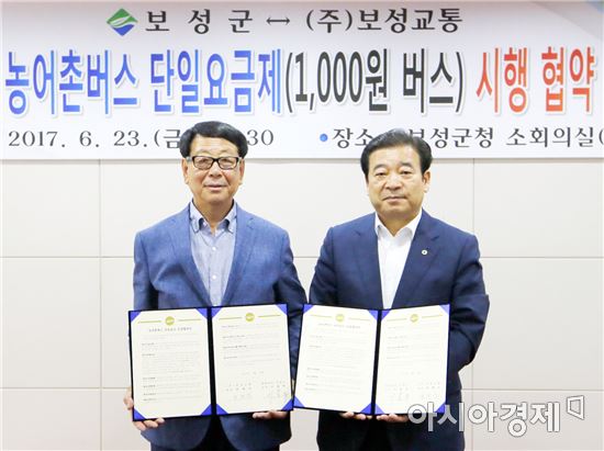[아시아경제 노해섭 기자]보성군(군수 이용부)은 7월 1일부터 천원버스 본격 시행을 위해 ㈜보성교통(대표 박재순)과 23일 군 소회의실에서 운송협약을 체결했다.