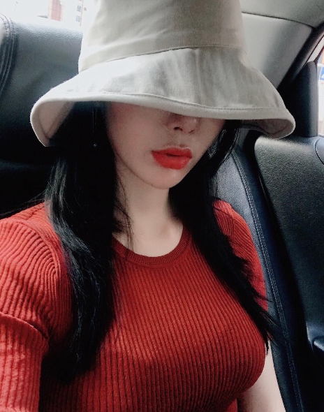 사진 속 그는 차 속에 앉은 채 베이지색 벙거지 모자를 쓰고 빨간색 골지티를 입고 있다. 특히 빨간색 립스틱과 대조되는 무결점 흰색 피부와 날렵한 '턱선'이 눈길을 사로잡는다.