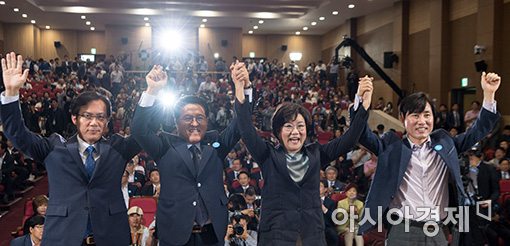 [아시아경제 윤동주 기자] 26일 국회에서 열린 바른정당 당 대표 및 최고위원 지명대회에서 신임 당 대표로 선출된 이혜훈 후보와 김영우, 정운천, 하태경 신임 최고위원이 손을 맞잡고 손을 번쩍 들고 있다.