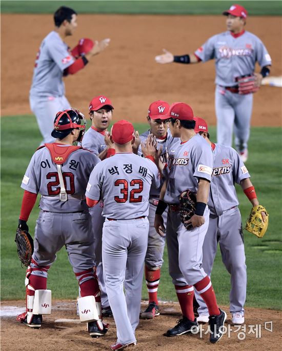 [아시아경제 김현민 기자]프로야구 SK 와이번스와 두산 베어스의 2017 KBO리그 경기가 27일 잠실구장에서 열렸다. SK 선수들이 5-1 승리를 확정한 뒤 기뻐하고 있다.