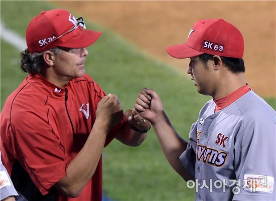 [아시아경제 김현민 기자]프로야구 SK 와이번스와 두산 베어스의 2017 KBO리그 경기가 27일 잠실구장에서 열렸다. SK 힐만 감독이 5-1 승리를 확정한 뒤 최정과 하이파이브하고 있다.