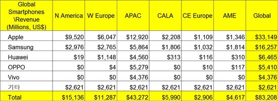 애플은 아시아태평양, 북미, 중남미, 중동, 동유럽, 서유럽 등 6개 지역 중 중동을 제외한 5개 지역에서 스마트폰 매출 1위에 올랐다. 신흥 시장인 중동 지역에서는 중저가폰 판매량이 높은 삼성전자가 1위를 차지했다.