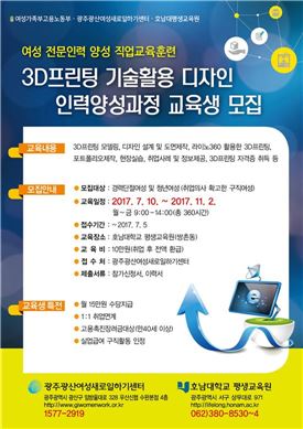 [아시아경제 노해섭 기자]호남대학교 평생교육원(원장 장석주)은 7월 1일까지 여성가족부 국비지원 취업연계프로그램인 ‘3D프린팅 기술 활용 디자인 인력양성과정’ 교육생을 모집한다.