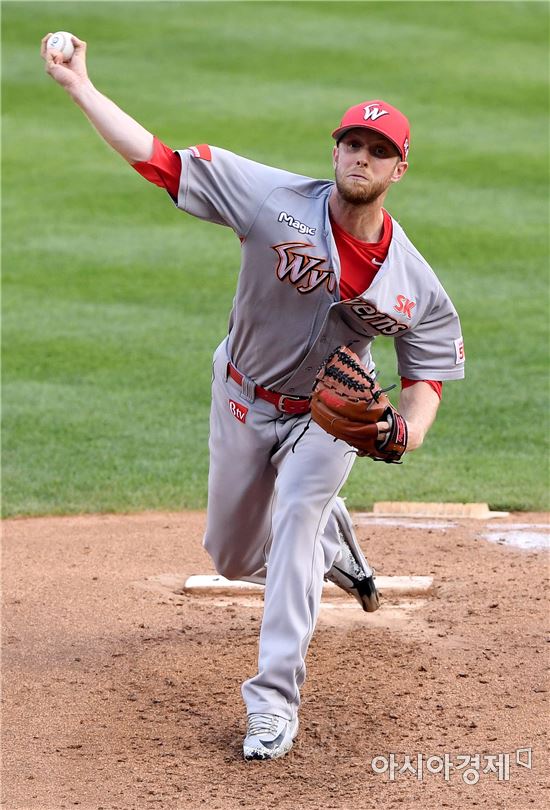 [아시아경제 김현민 기자]프로야구 SK 와이번스와 두산 베어스의 2017 KBO리그 경기가 28일 잠실구장에서 열렸다. SK 선발투수 켈리가 역투하고 있다.