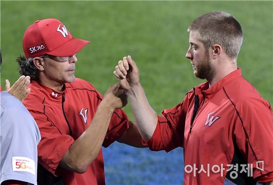 [아시아경제 김현민 기자]프로야구 SK 와이번스와 두산 베어스의 2017 KBO리그 경기가 28일 잠실구장에서 열렸다. SK 힐만 감독이 3-0 승리를 확정한 뒤 선발투수 켈리와 하이파이브하고 있다. 켈리는 7이닝 무실점 호투로 시즌 10승을 챙겼다.