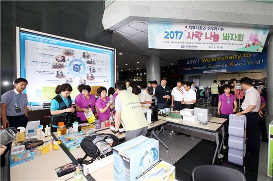 [아시아경제(대전) 정일웅 기자] 한국철도시설공단은 30일 대전 본사에서 7개 지역 복지기관과 함께 ‘2017년 사랑 나눔 바자회’를 개최했다고 밝혔다. 바자회는 철도공단 임직원이 기증한 2000여점의 서적·의류·잡화와 복지기관에서 직접 생산한 생활용품 및 가공식품을 전시·판매하는 형태로 진행됐다. 철도공단은 2013년부터 해마다 바자회를 열고 기부물품을 판매해 발생한 수익금 전액을 사회공헌 기금으로 사용해 왔다. 또 남은 기부물품은 노숙자와 쪽방생활자 등에게 전달했다. 한국철도시설공단 제공