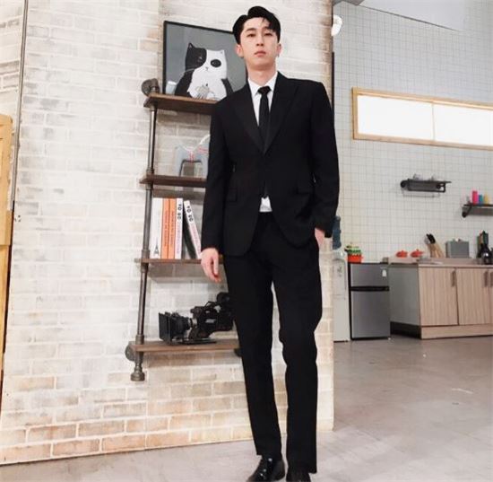 사진 속 슬리피는 블랙수트를 입고 포즈를 취하고 있다. 특히 슬리피의 작은 얼굴과 큰 키가 그의 비율은 돋보이게 만든다.