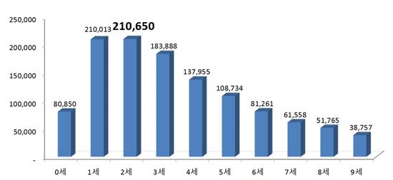 9세 이하 소아·아동의 연령 1세 구간별로 살펴보면 2세 아이가 21만1000명으로 가장 많았습니다. 1세 아이는 21만, 3세 아이는 18만 4000명 순으로 많았습니다.