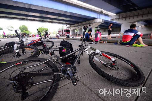 [아시아경제 문호남 기자] 서울 낮 최고기온이 33도로 찜통더위를 보인 6일 서울 여의도 마포대교 아래에서 자전거 동호회원들이 자전거를 눕혀둔 채 그늘에 앉아 더위를 식히고 있다.