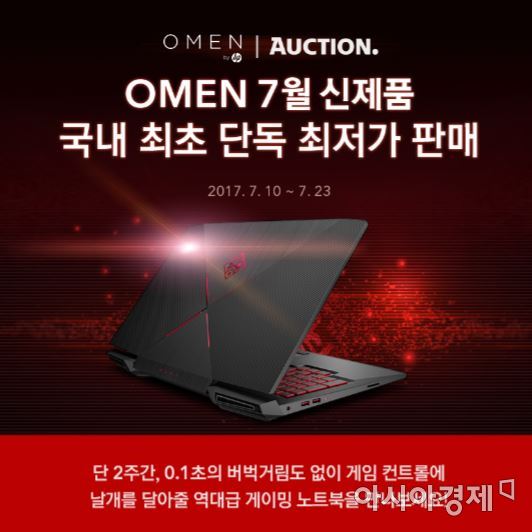 옥션은 10일부터 23일까지 2주 동안 게이머들이 열광하는 성능과 디자인을 갖춘 'OMEN by HP'(오멘) 신제품을 국내 단독으로 최저가에 판다고 9일 밝혔다.