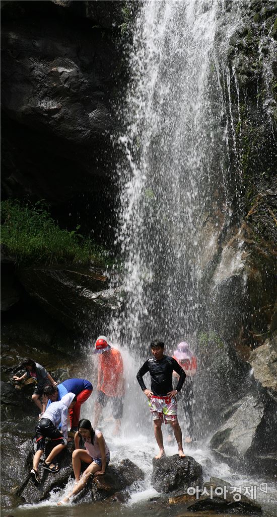 [아시아경제 노해섭 기자]9일 오후 계속되는 장마비가 잠시 멈추고 전남 구례군의 수은주가 32.5도까지 오르내리는 무더위 가운데 이른 피서객들이 구례군 산동면 수락폭포에서 더위를 식히고 있다.