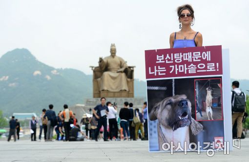 [아시아경제 문호남 기자] 초복을 하루 앞둔 11일 서울 종로구 광화문광장에서 동물보호단체 세이브코리언독스에서 활동하는 영국인 루시아 바버(Lucia Barber) 씨가 '개 식용 반대' 1인 시위를 하고 있다.