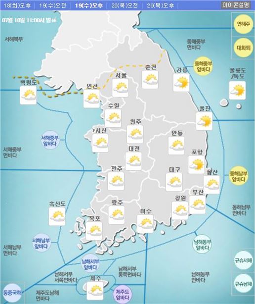 낮 예상 기온은 ▲서울 32도 ▲대전 33도 ▲대구 36도 ▲부산 31도 ▲광주 34도 ▲울산 31도 ▲포항 34도 ▲제주 33도 등이다.