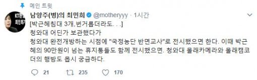 최 전 의원은 이 날 자신의 페이스북과 트위터를 통해 “번거롭더라도 청와대 어딘가 보관했다가, 청와대 완전 개방하는 시점에 ‘국정농단 반면교사’로 전시했으면 한다”고 글을 남겼다. 이어 “이 때 박근혜의 90만원이 넘는 휴지통들도 함께 전시했으면. 청와대 몰래카메라와 몰래캠코더의 행방도 몹시 궁금하다”고 덧붙였다.