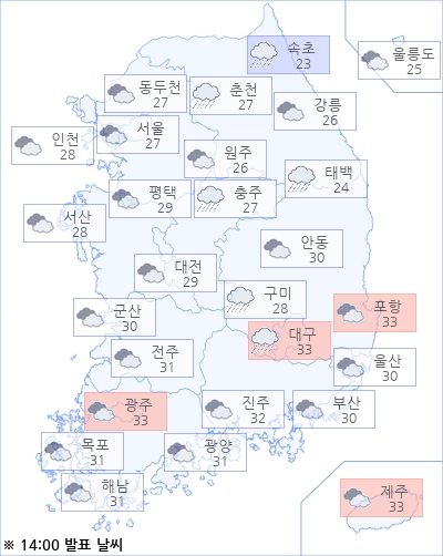 현재 기온이 가장 낮은 곳은 속초로 영상 23도이며, 포항은 영상 33도로 가장 높은 기온을 기록하고 있고, 아침 최저기온은 영상 22도에서 영상 28도, 낮 최고기온은 영상 27도에서 영상 37도가 되겠습니다.