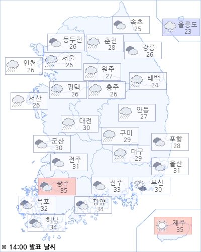 현재 기온이 가장 낮은 곳은 울릉도로 영상 23도이며, 광주는 영상 35도로 가장 높은 기온을 기록하고 있고, 아침 최저기온은 영상 22도에서 영상 28도, 낮 최고기온은 영상 27도에서 영상 35도가 되겠습니다.