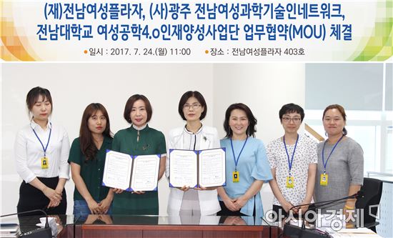 [아시아경제 노해섭 기자]전남여성플라자는 (사)광주·전남여성과학기술인네트워크, 전남대학교 여성공학4.o인재양성사업단과 전남 여성과학기술인의 교류협력 및 네트워크 활성화를 위한 업무협약을 체결했다고 26일 밝혔다.