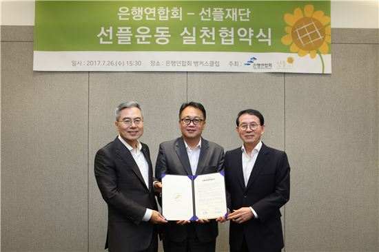 [아시아경제 박소연 기자]은행연합회와 선플재단은 26일 악플(악성댓글) 추방과 선플운동 확산을 위한 ‘선플운동 실천협약’을 체결했다. 하영구 은행연합회 회장(왼쪽부터), 민병두 더불어민주당 의원, 민병철 선플재단 이사장이 협약식 후 기념촬영을 하고 있다.
