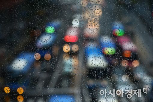 [아시아경제 문호남 기자] 전국이 대체로 흐리고 곳곳에 비가 내린 31일 서울 용산구 서울역 버스환승센터에서 차량들이 전조등을 켠 채 서행하고 있다.