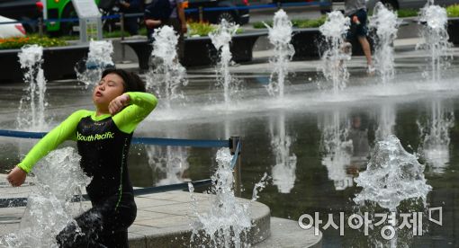 [아시아경제 문호남 기자] 서울 낮 최고기온이 34도까지 오르는 등 가마솥 더위를 보인 2일 서울 종로구 광화문광장 바닥분수를 찾은 어린이가 물놀이를 하며 더위를 식히고 있다.