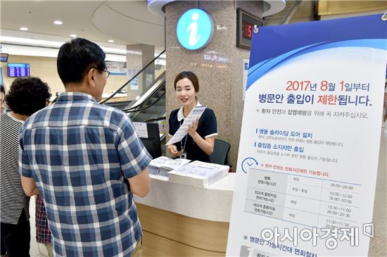입원환자들이 있는 병동 입구엔 스크린도어가 설치됐고, 벽면에 지정된 병문안 시간을 알리는 현수막이 부착됐다. 환자의 보호자에겐 통행이 가능한 출입증을 1매만 발급, 병동출입을 최소화했다. 병문안객들은 반드시 기록지를 남겨야한다.
