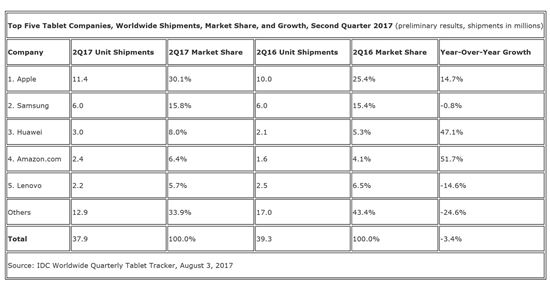 1위 애플은 지난해보다 14.7% 성장한 1140만대를 출하했다. 점유율은 25.4%에서 30.1%로 늘었다. 애플은 아이패드 라인업을 통합시키면서 10.5인치 아이패드 프로, 가격이 인하된 9.7인치 뉴 아이패드를 출시했다. 뉴 아이패드의 저렴한 가격이 교체 수요를 충족시켰고, 애플의 아이패드 비즈니스도 13분기 만에 반등했다.