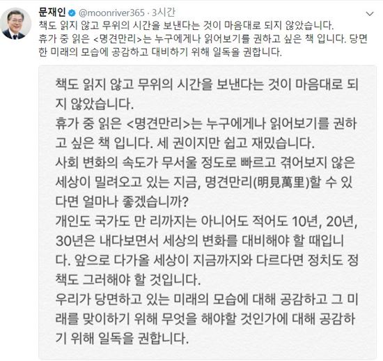 5일 문 대통령은 SNS에 “책도 읽지 않고 무위의 시간을 보낸다는 것이 마음대로 되지 않았다”며 “휴가 중 읽은 ‘명견만리’는 누구에게나 읽어보기를 권하고 싶은 책”이라고 밝혔다. 그는 “세 권이지만 쉽고 재밌다”는 설명도 덧붙였다.