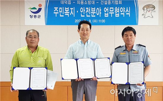 [아시아경제 노해섭 기자]장흥군 대덕읍(읍장 이재천)은 9일 읍사무소 회의실에서 대덕읍의용소방대(대장 김성수), 건설중기협회(대표 신재선)와 ‘주민 복지·안전분야’ 업무협약을 체결했다.