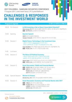 국내에서 활동하고 있는 CFA는 350여 명으로 삼성증권에 국내 기관 중 최다 인력이 근무중이다. 삼성증권이 공동주관하는 이번 행사는 톰슨로이터가 후원사로 참여하고, CFA 공인자격 보유자 및 유관업계 종사자들을 대상으로 진행된다.