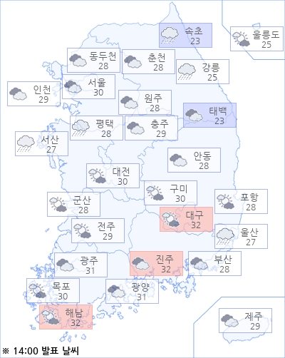 현재 기온이 가장 낮은 곳은 태백으로 영상 23도이며, 대구는 영상 32도로 가장 높은 기온을 기록하고 있고, 아침 최저기온은 영상 17도에서 영상 25도, 낮 최고기온은 영상 24도에서 영상 33도가 되겠습니다.