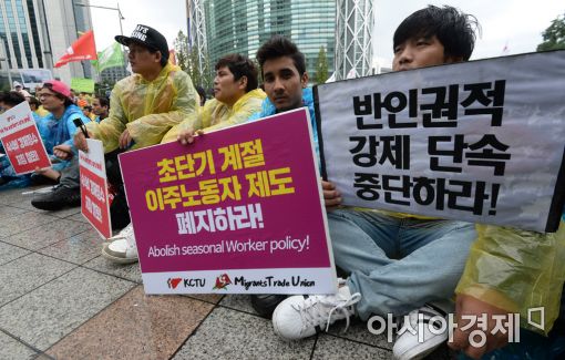 [아시아경제 문호남 기자] 전국 이주노동자들이 20일 서울 종로구 보신각 앞에서 열린 전국 이주노동자 결의대회에서 노동기본권 보장 및 고용허가제 폐지 등을 촉구하고 있다.