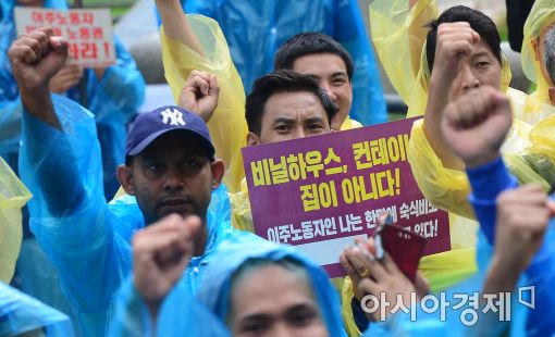[아시아경제 문호남 기자] 전국 이주노동자들이 20일 서울 종로구 보신각 앞에서 열린 전국 이주노동자 결의대회에서 노동기본권 보장 및 고용허가제 폐지 등을 촉구하며 구호를 외치고 있다.
