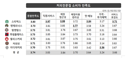 '매장접근성', '직원서비스', '맛ㆍ메뉴', '서비스 호감도'에서는 스타벅스가 높은 평가를 받았으며, '매장이용 편리성' 만족도는 엔제리너스가, '가격ㆍ부가혜택' 만족도는 이디야커피가 상대적으로 높았다.
