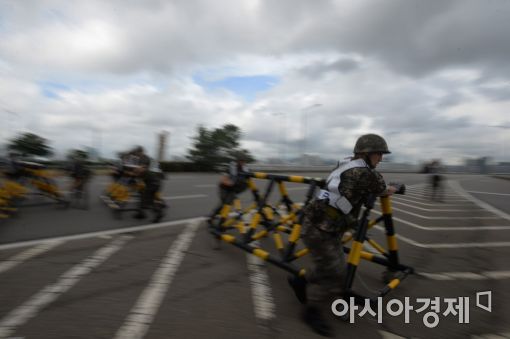 [아시아경제 문호남 기자] 을지연습과 연계한 민방공대피훈련이 실시된 23일 서울 마포대교에서 군·경이 합동으로 '전시 교통통제소 설치 훈련'을 하고 있다.