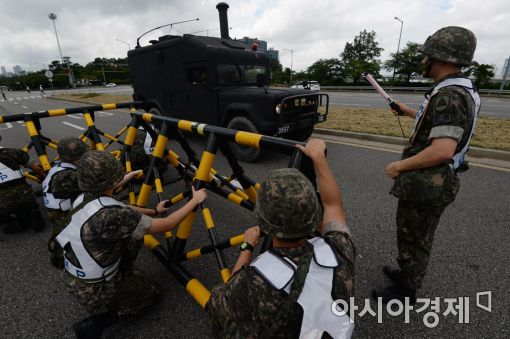 [아시아경제 문호남 기자] 을지연습과 연계한 민방공대피훈련이 실시된 23일 서울 마포대교에서 군·경이 합동으로 '전시 교통통제소 설치 훈련'을 하고 있다.