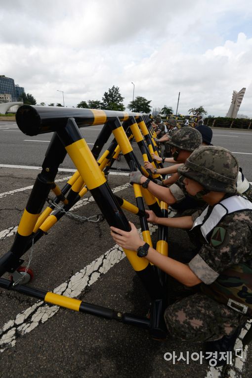 [아시아경제 문호남 기자] 을지연습과 연계한 민방공대피훈련이 실시된 23일 서울 마포대교에서 군·경이 합동으로 '전시 교통통제소 설치 훈련'을 하고 있다.