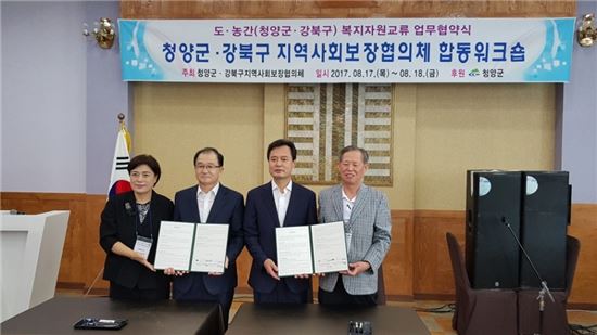 강북구지역사회복지협의체(위원장 박용옥)와 청양군지역사회보장협의체(위원장 김정숙)는 지난 17일 청양군에서 ‘도·농 간 복지자원교류 업무협약식’을 갖고 1박 2일간 합동 워크숍을 진행했다.